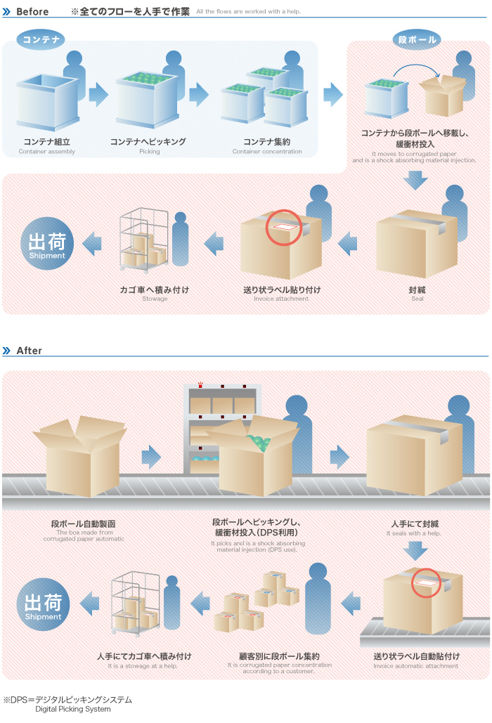 今までは出荷ケースへのピッキング前に、コンテナへの事前ピッキング作業をしていたが、以下のフローのようにこの事前ピッキングを排除できている。
